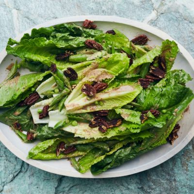 11.  Toss together the peas, romaine and pecan dressing in a large bowl. Top with reserved salt-roasted pecans and transfer to a serving platter.