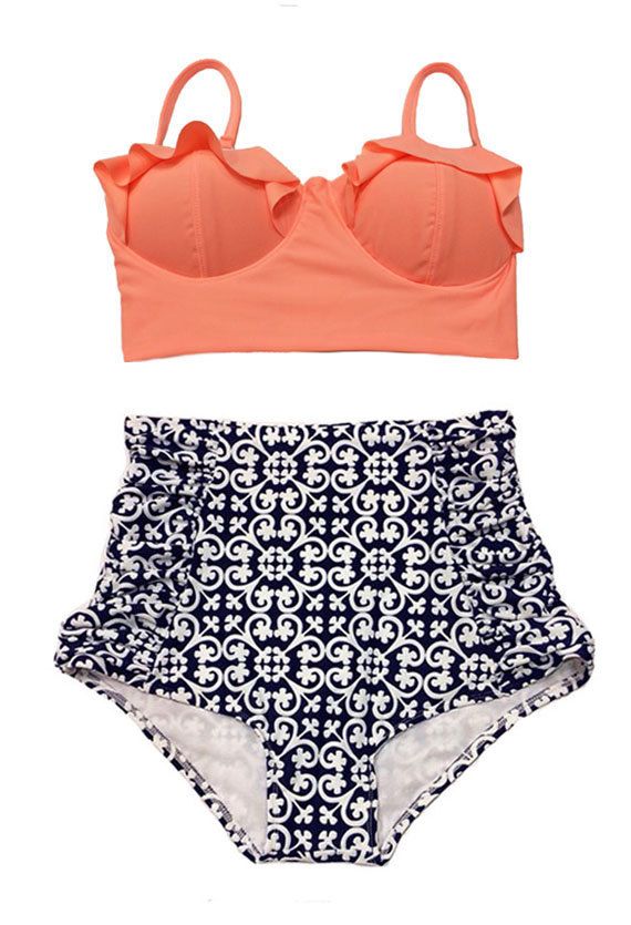 For the retro chick who digs the vintage style, this is the perfect bikini for you. The high-waisted look gives it that old-school feel and the peachy top will make your tan pop!